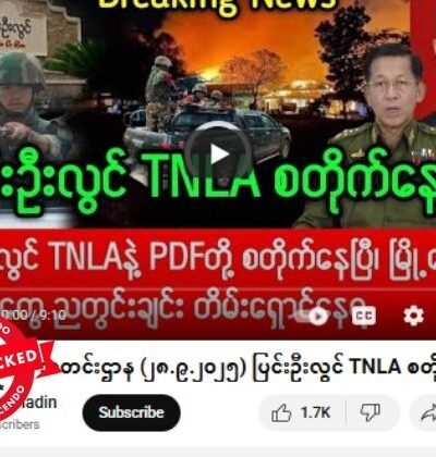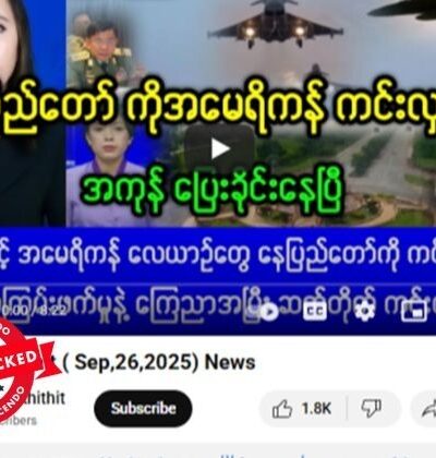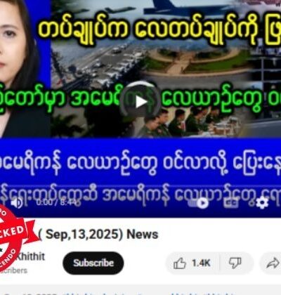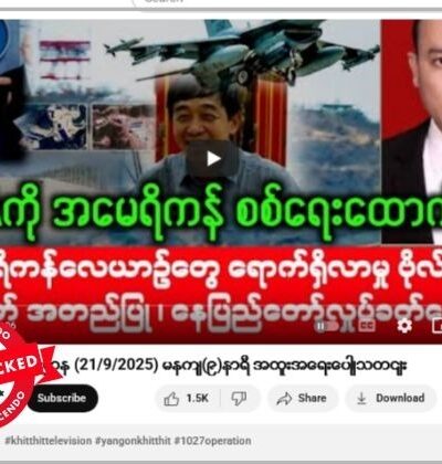 နေပြည်တော်ကို အကြမ်းဖက်အဖြစ် ကြေညာပြီး အမေရိကန်က လေယာဉ်တွေနဲ့ ဆက်တိုက်ကင်းလှည့်နေတယ် ဆိုတဲ့ ဗွီဒီယိုတွေ ယူကျူ့မှာ ပျံ့နှံ့မှုအားကောင်းနေတာ တွေ့ရပါတယ်။ သတင်းတုဖြန့်ချိနေခြင်းဖြစ်တယ်။ ပျံ့နှံ့မှုအားကောင်းနေတဲ့ ဗွီဒီယိုပို့စ် စခရင်ရှော့ဓာတ်ပုံနဲ့ စာသားကောက်နုတ်ချက်ကို အောက်မှာကြည့်ပါ။ စက်တင်ဘာ ၂၆ ရက်မှာ ဖြန့်ဝေထားတဲ့ ဒီဗွီဒီယိုဟာ ၂၄ နာရီအတွင်း ကြည့်ရှု့မှုပေါင်း ၁ ဒသမ ၅ သိန်းဝန်းကျင်ရရှိထားတယ်။ “နေပြည်တော် ကိုအမေရိကန် ကင်းလှည့်နေ အကုန်ပြေးခိုင်းနေပြီ အဆင့်မြင့် အမေရိကန်လေယာဉ်တွေ နေပြည်တော်ကို ကင်းထောက် အကြမ်းဖက်မှုနဲ့ ကြေညာအပြီး ဆက်တိုက် ကင်းထောက်” Original link | Archive link အချက်အလက်စိစစ်ချက် ဗွီဒီယိုဖြန့်ဝေထားတဲ့ “Mandalay KhitThit”အမည်နဲ့ ယူကျူ့ချန်နယ်ဟာ သတင်းမီဒီယာတချို့က သတင်းတွေ ကို ကူးယူပြီး […]