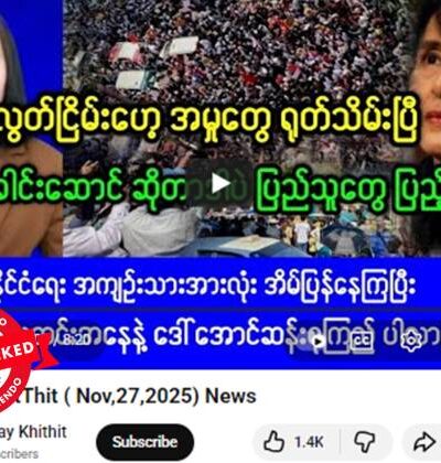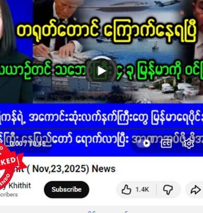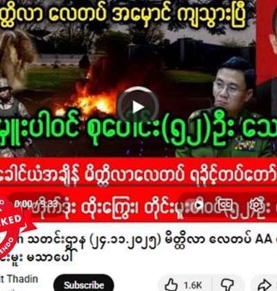 TNLA အထွေထွေအတွင်းရေးမှူး ဗိုလ်ချုပ်တာဘုန်းကျော်၊ MNDAA ခေါင်းဆောင် ဖုန်တာရွှင်တို့က NUG အပေါ် ဝေဖန်ချက်ဆိုပြီး ပို့စ်တခု ဖေ့စ်ဘွတ်မှာ ပျံ့နှံ့မှုအားကောင်းလျက်ရှိတယ်။ နားလည်မှုလွဲမှားစေနိုင်တဲ့ သတင်းတု ဖြန့်ချိနေခြင်းဖြစ်တယ်။ TNLA ကလည်း ဗိုလ်ချုပ်တာဘုန်းကျော်က ဒီလိုပြောကြားချက် မရှိကြောင်း တရားဝင် ငြင်းဆိုထားတယ်။ ၂၀၂၇ စစ်ဆင်ရေးနဲ့ မြန်မာအာဏာသိမ်းစစ်တပ်ဆီကနေ နယ်မြေအများအပြား သိမ်းယူနိုင်ခဲ့ပေမဲ့ တရုတ်နိုင်ငံရဲ့ ဖိအားပေးမှုကြောင့် သိမ်းပိုက်နယ်မြေအချို့ကို ပြန်ပေးအပ်ကာ ငြိမ်းချမ်းရေးရယူခဲ့ရပြီးနောက် ဒီ ၂ ဖွဲ့ဟာ မြန်မာလူထုရဲ့ ဝေဖန်မှုကို ခံနေရချိန်လည်းဖြစ်တယ်။ ပျံ့နှံ့မှုအားကောင်းနေတဲ့ ဖေ့စ်ဘွတ်ပို့စ်က ရယူထားတဲ့ စခရင်ရှော့ဓာတ်ပုံနဲ့ စာသားကောက်နုတ်ချက်ကို အောက်မှာကြည့်ပါ။ တူညီတဲ့ ရေးသားမျှဝေမှုတွေကို ဒီနေရာမှာလည်း တွေ့ရပါတယ်။ “ဘယ် NUG လော်ဘီ မီဒီယာမှမတင်ပြရဲသော အမှန်တရားများ”ဆိုပြီး “star news”အမည်နဲ့ […]