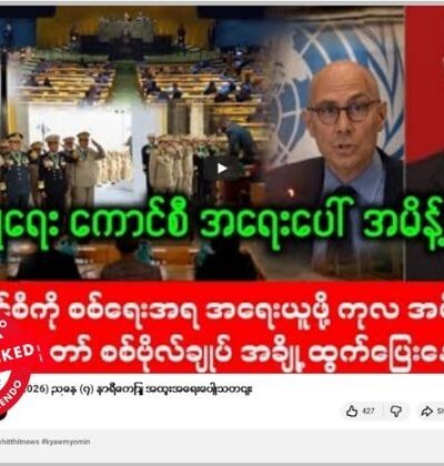 မြန်မာစစ်တပ်က လေကြောင်းဗုံးကြဲတိုက်ခိုက်မှုများကို စစ်ရေးအရ အရေးယူဖို့ ကုလသမဂ္ဂ လုံခြုံရေးကောင်စီ အရေးပေါ်အမိန့် ထုတ်ပြန်လိုက်တယ်လို့ ဆိုထားတဲ့ ဗွီဒီယိုဟာ ယူကျူ့မှာ ပျံ့နှံ့မှုအားကောင်းနေတာတွေ့ရတယ်။ သတင်းတု ဖြန့်ချိ နေခြင်းဖြစ်တယ်။ ပျံ့နှံ့မှုအားကောင်းနေတဲ့ ဗွီဒီယိုပို့စ်တခုက ရယူထားတဲ့ စခရင်ရှော့ဓာတ်ပုံနဲ့ စာသားကောက်နုတ်ချက်ကို အောက်မှာကြည့်ပါ။ “လုံခြုံရေး ကောင်စီ အရေးပေါ် အမိန့်ထုတ် စစ်ကောင်စီကို စစ်ရေးအရ အရေးယူဖို့ ကုလ အမိန့်ထုတ်ပြီ နေပြည်တော် စစ်ဗိုလ်ချုပ် အချို့ ထွက်ပြေးနေပြီ” Original link | Archive link အချက်အလက်စိစစ်ချက် မြန်မာစစ်တပ်က လေကြောင်းဗုံးကြဲတိုက်ခိုက်မှုများကို စစ်ရေးအရ အရေးယူဖို့ ကုလသမဂ္ဂ လုံခြုံရေးကောင်စီ အရေးပေါ်အမိန့် ထုတ်ပြန်လိုက်တယ်ဆိုတဲ့ သတင်းကို သတင်းလုပ်ငန်းလုပ်ကိုင်နေတဲ့ အဓိက မီဒီယာတွေမှာ ဖြစ်စေ ယုံကြည်ရလောက်တဲ့ သတင်းအရင်းအမြစ်တွေမှာ […]