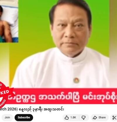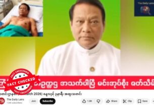 ပြည်ထောင်စုကြံ့ခိုင်ရေးနဲ့ ဖွံ့ဖြိုးရေးပါတီ(USDP)ဥက္ကဋ္ဌ ဦးခင်ရီ ဆူးလေဟိုတယ်မှာ လုပ်ကြံသတ်ဖြတ်ခံရတယ် လို့ဆိုထားတဲ့ ဗွီဒီယိုကို ယူကျူ့ချန်နယ်တခုက ဖြန့်ဝေထားရာမှာ မှုပျံ့နှံ့မှုအားကောင်းနေတယ်။ သတင်းတု ဖြန့်ချိ နေခြင်း သာဖြစ်တယ်။ ပျံ့နှံ့မှုအားကောင်းနေတဲ့ ဗွီဒီယိုပို့စ်တခုက ရယူထားတဲ့ စခရင်ရှော့ဓာတ်ပုံနဲ့ စာသားကောက်နုတ်ချက်ကို အောက်မှာကြည့်ပါ။ တူညီတဲ့ မျှဝေမှုကို ဒီနေရာမှာလည်း တွေ့ရတယ်။ “ဆူးလေ ဟော်တယ်မှာ သတ်ခံရ ဗိုလ်ချုပ်အောင်ဆန်း ကို လုပ်ကြံတာထက် ဆိုးတယ် ကြံ့ခိုင်ရေး ဥက္ကဌ ဦးခင်ရီ ကို သတ်သွားတာ အားရ” (မူရင်းအရေးအသား) Original link | Archive link အချက်အလက်စိစစ်ချက် သတင်းလုပ်ငန်းလုပ်ကိုင်နေတဲ့ အဓိကကျတဲ့ မီဒီယာတွေနဲ့ ယုံကြည်ရလောက်တဲ့ သတင်းအရင်းအမြစ်တွေမှာ USDP ဥက္ကဌ လုပ်ကြံခံရတယ်ဆိုတဲ့ ဖော်ပြချက် မတွေ့ရပါဘူး။ ဒီလိုပြောဆိုပြီး […]