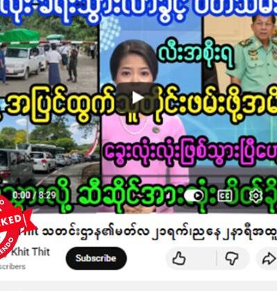နေပြည်တော်မှာငလျင်ထပ်လှုပ်ပြီး စစ်ရှုံးချုပ် ပြိုကျကာ စစ်ခေါင်းဆောင် မိသားစုလိုက်သေဆုံးသွားတယ်လို့ ဆိုထားတဲ့ ဗွီဒီယိုတွေ ယူကျူ့ချန်နယ်တခုက ဖြန့်ဝေထားရာ ပျံ့နှံ့မှုအားကောင်းနေတယ်။ သတင်းတု တခုသာဖြစ်တယ်။ ပျံ့နှံ့မှုအားကောင်းနေတဲ့ ဗွီဒီယိုပို့စ်တခုက ရယူထားတဲ့ စခရင်ရှော့ဓာတ်ပုံနဲ့ စာသားကောက်နုတ်ချက်ကို အောက်မှာကြည့်ပါ။ အလားတူတဲ့ မျှဝေမှုကို ဒီနေရာမှာလည်း တွေ့ရတယ်။ “နေပြည်တော် အပြင်းထန်ဆုံး ငလျင်ထပ်လှုပ် စစ်ရှုံးချုပ် ပြိုကျပြီး စစ်ခေါင်းဆောင်ပါ သေဆုံး နေပြည်တော် အပြင်းထန်ဆုံး ငလျင်ထပ်လှုပ်၊ စစ်ရုံးချုပ် ပြိုကျပြီး စစ်ခေါင်းဆောင် မိသားစုလိုက် အလောင်းပျောက်စီး” Original link | Archive link အချက်အလက်စိစစ်ချက် ဗွီဒီယိုဖြန့်ဝေထားတဲ့ “Khit Thit Thadin”ယူကျူ့ချန်နယ်ဟာ လုပ်ကြံရေးသားပြောဆိုမှုတွေနဲ့ သတင်းမီဒီယာတွေက သတင်းတွေကို ရောနှော ဖြန့်ချိတာ၊ မီဒီယာတွေမှာဖော်ပြခဲ့ပြီးဖြစ်တဲ့ သတင်းတွေကို သတင်းခေါင်းစဉ်တုတပ် […]