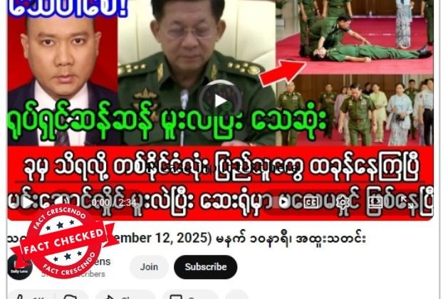 စစ်ခေါင်းဆောင် ဗိုလ်ချုပ်မှူးကြီးမင်းအောင်လှိုင်ဟာ မူးလဲကျပြီး သေဆုံးမှုဆိုပြီး ဗွီဒီယိုကို ယူကျူ့ ချန်နယ်တခုက ဖြန့်ဝေထားရာ ပျံ့နှံ့မှုအားကောင်းနေတာ တွေ့ရပါတယ်။ သတင်းတုသာဖြစ်တယ်။ ပျံ့နှံ့မှုအားကောင်းနေတဲ့ ဗွီဒီယိုပို့စ်ရဲ့ စခရင်ရှော့ဓာတ်ပုံနဲ့ စာသားကောက်နုတ်ချက်ကို အောက်မှာကြည့်ပါ။ “ရုပ်ရှင်ဆန်ဆန် မူးလဲပြီး သေဆုံး ခုမှ သိရလို့ တစ်ိုင်ငံလုံး ပြည်သူတွေ ထခုန်နေကြပြီ မင်းအောင်လှိုင် မူးလဲပြီး ဆေးရုံမှာ မသေမရှင်ဖြစ်နေပြီ” Original link | Archive link အချက်အလက်စိစစ်ချက် ဗွီဒီယိုကို ဖြန့်ဝေထားတဲ့ “The Daily Lens”အမည်နဲ့ ယူကျူ့ချန်နယ်ဟာ သတင်းမီဒီယာ တချို့မှာဖော်ပြခဲ့တဲ့ သတင်းတွေကို လိုအပ်သလိုပြောဆိုဖြန့်ချိတာ၊ လုံဝ လုပ်ကြံပြောဆိုတာတွေပြုလုပ်ဖြန့်ချိတဲ့ နေရာဖြစ်တယ်။ ဒီချန်နယ်နဲ့ ပတ်သက်ပြီး Fact Crescendo Myanmar ရဲ့ အချက်အလက်စိစစ်ချက် တွေကို […]