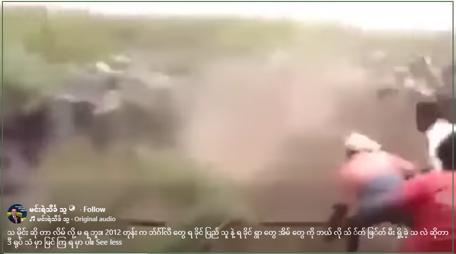 ၂၀၁၂ ခုနှစ်က ရိုဟင်ဂျာတွေ က ရခိုင်တွေနဲ့ ရခိုင်အိမ်တွေကို သတ်ဖြတ်မီး ရှို့ ခဲ့တဲ့ မှတ်တမ်းဆိုပြီးတော့ ဗွီဒီယို တခုက ပြီးခဲ့တဲ့ရက်ပိုင်းအတွင်း ပျံ့နှံ့ခဲ့တာတွေ့ တွေ့ရပါတယ်။ ဖြန့်ဝေထားတဲ့ ဗွီဒီယိုထဲမှာ မြင်ကွင်းဟာ ကြည်လင်ပြတ်သားမှုမရှိဘဲ ဝေဝါးနေပေမဲ့ လူအုပ်ကြီးက အော်ဟစ်တိုက်ခိုက်နေတဲ့ ပဋိပက္ခမြင်ကွင်းကို ဖော်ပြထားတာကို သိနိုင်ပါတယ်။ ဒါပေမဲ့ ဒီပြောဆိုချက်နဲ့ မြင်ကွင်းဗွီဒီယိုအစိတ်အပိုင်းဟာ မှားယွင်းပြီး သက်ဆိုင်ခြင်းမရှိပါဘူး။