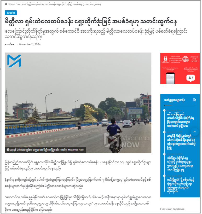 ၂၀၂၄ ခုနှစ် နိုဝင်ဘာအတွင်းမှာ မိတ္ထီလာက ရှမ်းတဲလေတပ်စခန်းတိုက်ခိုက်ခံရမှု သတင်းကို လိုအပ်သလို ခေါင်းစဉ်တုတပ်ကာပြန်လည်ဖြန့်ချိနေခြင်းဖြစ်တယ်။ အဲဒီအချိန်က အသေခံ ဒုံး၊ ရှော့တိုက်ဒုံးတွေနဲ့ ကျယ်ကျယ်ပြန့်ပြန့် တိုက်ခိုက်ဖို့ ကြိုးပမ်းခဲ့တာဖြစ်ပေမဲ့ လေတပ်ဦးစီးမှုအပါ ၁၉ ဦးသေဆုံးတဲ့အကြောင်း ယုံကြည်ရလောက်တဲ့ သတင်းအရင်းအမြစ်တွေမှာ ဖော်ပြချက်မရှိခဲ့ပါဘူး။