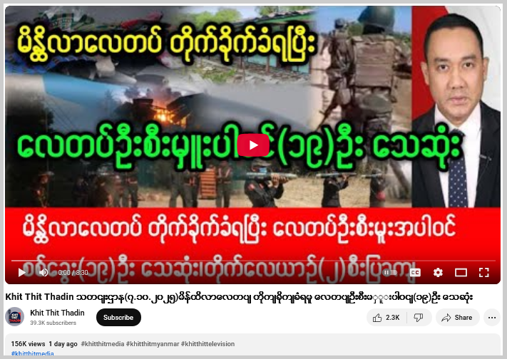 ဗွီဒီယိုဖြန့်ဝေထားတဲ့ “Khit Thit Thadin”အမည်နဲ့ ယူကျူ့ချန်နယ်ကို ကြည့်မယ်ဆိုရင် သတင်းမီဒီယာတချို့က သတင်းတွေကို ပြန်လည်ကူးယူပြီး သတင်းခေါင်းစဉ်တုတပ် ဖြန့်ချိတာတွေပြုလုပ်တာတွေ့ရတယ်။