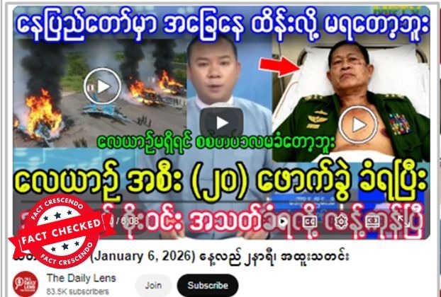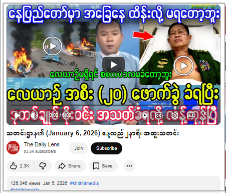 ဗွီဒီယိုဖြန့်ဝေထားတဲ့ “The Daily Lens”အမည်နဲ့ ယူကျူ့ချန်နယ်ဟာ လုပ်ကြံရေးသား ပြောဆိုချက်တွေနဲ့ သတင်းမီဒီယာတချို့မှာ ဖော်ပြခဲ့တဲ့ အကြောင်းအရာတွေကို ပြန်လည်ဖြန့်ချိနေတဲ့နေရာဖြစ်တာတွေ့ရတယ်။ ဒီချန်နယ်နဲ့ ပတ်သက်တဲ့ Fact Crescendo Myanmar ရဲ့ အချက်အလက်စိစစ်ချက်တွေကို ဒီလင့်ခ်မှာ ကြည့်ပါ။
