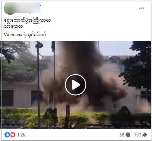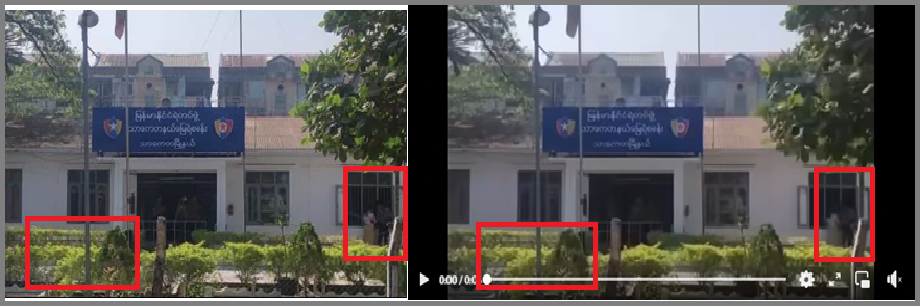 သာကေတရဲစခန်းကို မြို့ပြပျောက်ကျားအဖွဲ့တဖွဲ့က လက်ပစ်ဗုံးနဲ့ ပစ်ခတ်တိုက်ခိုက်ခဲ့အပြီးမှာ ရဲစခန်းရှေ့ ဗုံးကွဲမှု ဗွီဒီယိုလို့ဆိုပြီး ဗွီဒီယိုတခု ပျံ့နှံ့မှု အားကောင်းလျက်ရှိတယ်။ တကယ်မှာ ဉာဏ်ရည်တု(AI) အသုံးပြု ဖန်တီးထားတဲ့ ဗွီဒီယိုဖြစ်တာတွေ့ရတယ်။