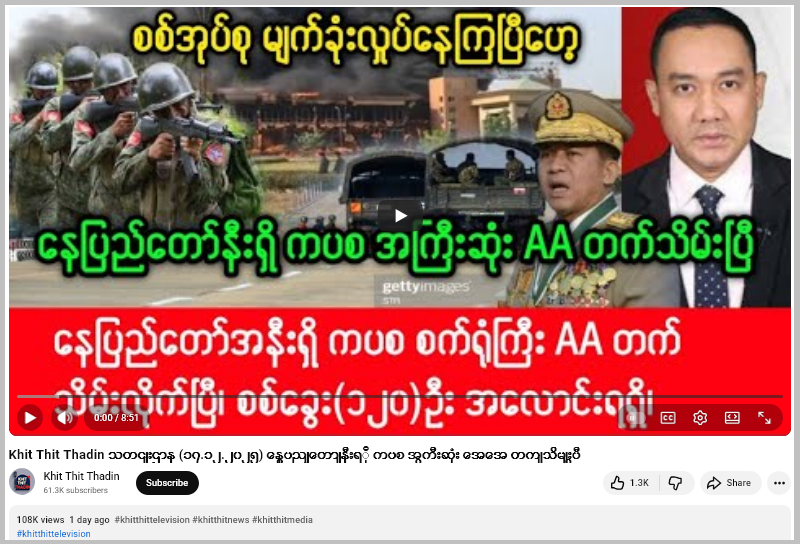 ဗွီဒီယို ဖြန့်ချိထားတဲ့ “Khit Thit Thadin”ဟာ သတင်းလုပ်ငန်းလုပ်ကိုင်နေတဲ့ မီဒီယာတချို့က သတင်းတွေကို သတင်းခေါင်းစဉ်တုတပ်ကာ ဖြန့်ချိတဲ့နေရာဖြစ်တယ်။ နေပြည်တော်အနီးက အကြီးဆုံး ကပစ စက်ရုံကို AA သိမ်းပိုက်လိုက်ပြီဆိုတာ မဟုတ်ပါဘူး။