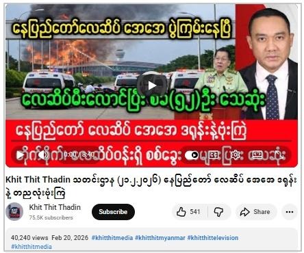 ဗွီဒီယိုဖြန့်ဝေထားတဲ့ “Khit Thit Thadin” ယူကျူ့ချန်နယ်ဟာ လုပ်ကြံသတင်းတွေနဲ့ မီဒီယာတချို့က သတင်းတွေကို ပြန်လည်ကူးယူဖော်ပြပြီး ခေါင်းစဉ် တုတပ် ဗွီဒီယိုတွေကာ ပြန်လည် ဖြန့်ချိတဲ့နေရာဖြစ်တယ်။ နေပြည်တော် လေဆိပ်ကို AA တိုက်ခိုက်မှု အထောက်အထား တစုံတရာမရှိသလို ယုံကြည်ရတဲ့ အရင်းအမြစ်တွေမှာ ဖော်ပြချက်မရှိပါဘူး။