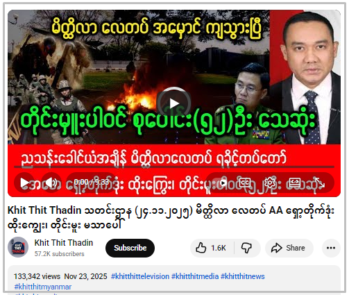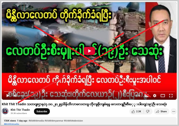 ဗွီဒီယိုဖြန့်ဝေထားတဲ့ “Khit Thit Thadin” ယူကျူ့ချန်နယ်ဟာ သတင်းမီဒီယာ တချို့က သတင်းတွေကို သတင်းခေါင်းစဉ်တု တပ်ကာ ဖြန့်ချိလေ့ရှိ ပါတယ်။ ဒီချန်နယ်နဲ့ပတ်သက်ပြီး Fact Crescendo Myanmar ရဲ့ အချက်အလက်စိစစ်ချက်တွေကို ဒီလင့်ခ်မှာ ကြည့်ပါ။