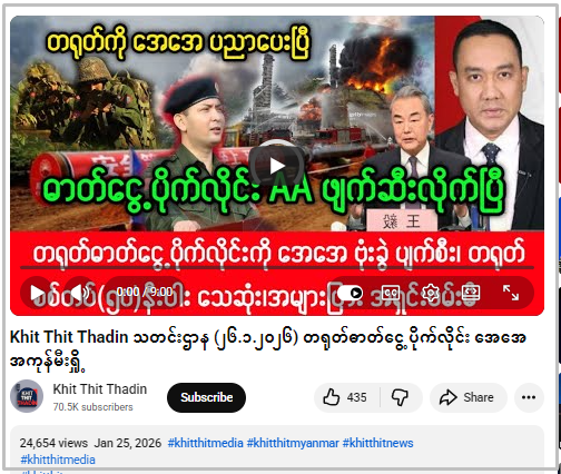 အခုလည်း “Khit Thit Thadin”က ဓာတ်ငွေ့ပိုက်လိုင်းကို AA ဖောက်ခွဲလိုက်ပြီလို့ ဆိုထားပေမဲ့ ဗွီဒီယိုထဲမှာ “မြင်းခြံမြို့နယ်မှာရှိတဲ့ ကြံ့ခိုင်ရေးပါတီရုံး၊ ကျောက်ရုံးကြီးနဲ့ မဲရုံတွေကို ဒရုန်းနဲ့ ဗုံးကြဲတိုက်ခိုက်မှု”၊ “လောင်းလုံးတွင် မြို့မရဲစခန်းနှင့် မောင်းမကန်ရွာ မဲရုံတို့ကို ဒရုန်းဖြင့် တိုက်ခိုက်မှု”၊ “မြိုင်မြို့နယ်၊ ကန်နီပျူစောထီးရွာမှ ရိက္ခာရှာရန် ထွက်လာသော စစ်တပ်ကို တိုက်ခိုက်မှု ပျူစောထီး ၂ ဦး သေဆုံးပြီး တော်လှန်ရေးရဲဘော် ၄ ဦး ကျဆုံး”စတဲ့ ရန်ကုန်ခေတ်သစ်သတင်းဌာနက ဖော်ပြခဲ့တဲ့ သတင်းကို ပြန်လည် ကူးယူဖော်ပြပြီး သတင်း ခေါင်းစဉ်တုတပ်ထားတယ်။