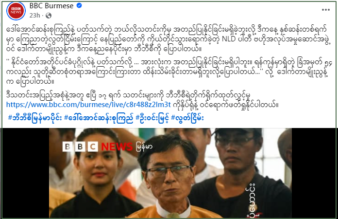 မြန်မာနှစ်ဆန်း ၁ ရက်(ဧပြီ ၁၇ ရက်)က တောင်ငူထောင်မှာ ဖမ်းဆီးထားတဲ့ သမ္မတဦးဝင်းမြင့်အပါအဝင် နိုင်ငံရေးအကျဉ်းသားတချို့ ပြန်လည်လွတ်မြောက်လာခဲ့ပြီးနောက်မာ ဒေါ်အောင်ဆန်းစုကြည်ကိုလည်း ရန်ကုန်နေအိမ် ခြံအမှတ် ၅၄ ကို ပြန်ပို့မယ်ဆိုတဲ့ သတင်းတွေလည်း ထွက်ပေါ်ခဲ့ပါတယ်။ ဒါပေမဲ့ ကောလာဟလ သတင်းတခုသာဖြစ်ခဲ့ပြီး ဧပြီ ၁၈ ရက်အထိ ဒေါ်အောင်ဆန်းစုကြည်ကို နေအိမ်အကျယ်ချုပ်အဖြစ် ပြောင်းလဲထားတယ်ဆိုတဲ့ အချက်ကို အတည်ပြုနိုင်ခြင်းမရှိသေးပါဘူး။ အခုလို သတင်းခေါင်းစဉ်တု တပ်ဖြန့်ချိထားတဲ့ ဗွီဒီယိုထဲမှာလည်း သမ္မတဦးဝင်းမြင့် ပြန်လည်လွတ်မြောက်လာတဲ့အကြောင်းနဲ့ ဒေါ်အောင်ဆန်းစုကြည်အကြောင်း အတည်မပြုနိုင်သေးကြောင်းပဲ ဖော်ပြထားတယ်။