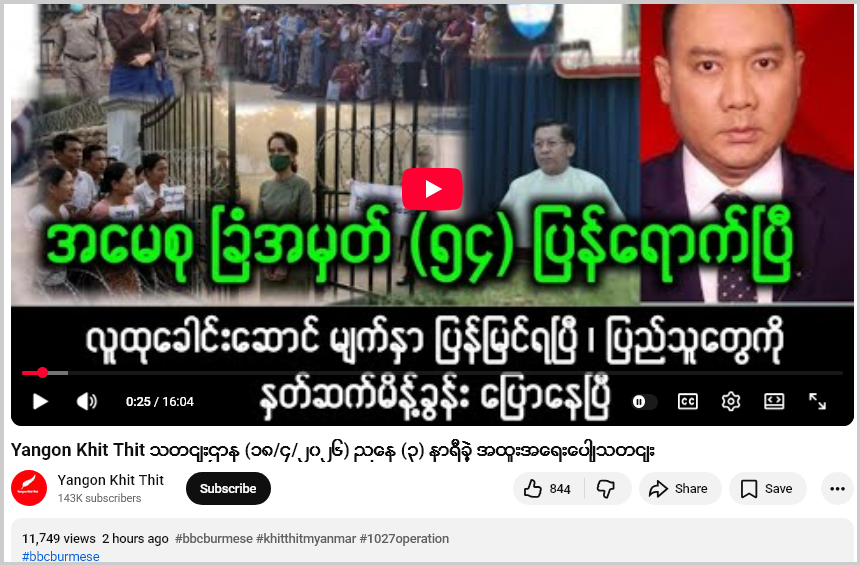 ဒေါ်အောင်ဆန်းစုကြည် ပြန်လွတ်လာပြီဆိုတဲ့ပြောဆိုဖြန့်ဝေထားတဲ့ “Yangon Khit Thit”ယူကျူ့ချန်နယ်ဟာ သတင်းမီဒီယာတချို့က သတင်းတွေကို ပြန်လည် ကူးယူဖော်ပြရာမှာ သတင်းခေါင်းစဉ်တုတပ်ပြီး ဖြန့်ဝေတာ၊ လုပ်ကြံရေးသား ပြောဆိုချက်တွေ ဖြန့်ဝေတာတွေ ပြုလုပ်တဲ့ ချန်နယ် တခုဖြစ်တယ်။ ဒီချန်နယ်နဲ့ ပတ်သက်ပြီး Fact Crescendo Myanmar မှာ အချက်အလက်စိစစ်ချက် မကြာခဏ ဖော်ပြခဲ့ပြီးဖြစ်တယ်။