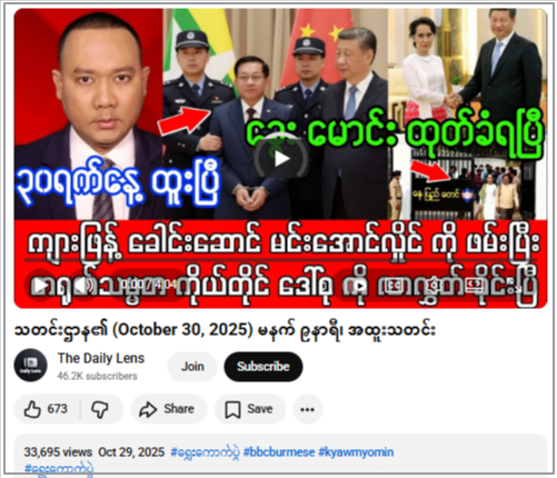 ဗွီဒီယိုဖြန့်ဝေထားတဲ့ “The Daily Lens”အမည်နဲ့ ယူကျူ့ချန်နယ်ဟာ သတင်းမီဒီယာတွေမှာ ဖော်ပြခဲ့ပြီးတဲ့ အကြောင်အရာတွေကို လိုအပ်သလို ပြန်လည်ပြောဆိုပြီး ခေါင်းစဉ်တုတပ်ကာ ပြန်လည်ဖြန့်ချိတာ ဒါမှမဟုတ် လုံးဝလုပ်ကြံပြောဆိုတာတွေ ပြုလုပ်တဲ့နေရာတခုဖြစ်တယ်။ ဒီချန်နယ်နဲ့ ပတ်သက်တဲ့ Fact Crescendo Myanmar ရဲ့ အချက်အလက်စိစစ်မှု တွေကို ဒီလင့်ခ်မှာ ကြည့်ပါ။