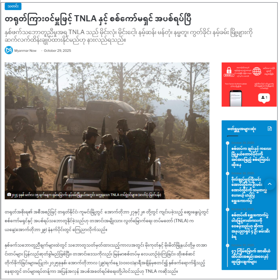 အခုလည်း သတင်းခေါင်းစဉ်တုတပ် ဗွီဒီယိုထဲမှာ ဖော်ပြထားတဲ့အကြောင်းအရာဟာ “တရုတ်ကြားဝင်မှုဖြင့် TNLA နှင့် စစ်ကော်မရှင် အပစ်ရပ်”၊ “မြန်မာစစ်တပ် ကျင်းပမည့် ရွေးကောက်ပွဲမတိုင်မီ တိုင်းရင်းသားများနှင့် အတိုက်အခံ အင်အားစု များအားလုံးကို မလေးရှားနိုင်ငံ၊ ကွာလာလမ်ပူမြို့သို ဖိတ်ခေါ် ဆွေးနွေးမည်ဟု မလေးရှားဝန်ကြီးချုပ် ထုတ်ပြော” သတင်းတွေကို လိုအပ်သလို ပြန်လည်ဖော်ပြနေခြင်းဖြစ်တယ်။