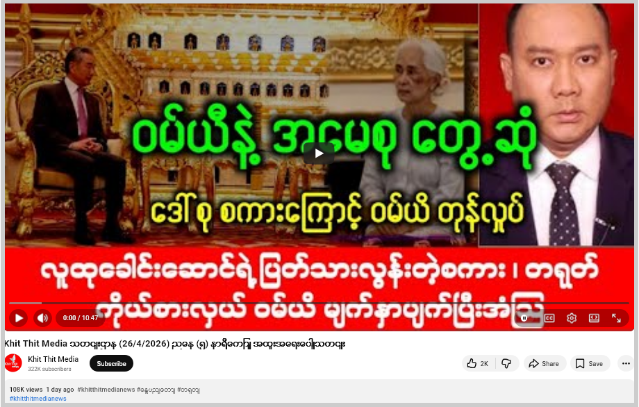 “Khit Thit Media”ယူကျူ့ချန်နယ်ဟာ လုံးဝလုပ်ကြံရေးသားဖြန့်ဝေမှုတွေ ဒါမှမဟုတ် သတင်းမီဒီယာတချို့က သတင်းတွေကို ပြန်လည်ဖော်ပြပြီး သတင်းခေါင်းစဉ်တုဖြန့်ချိတာ ပြုလုပ်တဲ့နေရာဖြစ်တယ်။ အခုလည်း တရုတ်နိုင်ငံခြားရေးဝန်ကြီး ဝမ်ယိဟာ နေပြည်တော်မှာ အကျယ်ချုပ်ကျနေတဲ့ လူထုခေါင်းဆောင် ဒေါ်အောင်ဆန်းစုကြည်နဲ့ သွားရောက်တွေ့ဆုံခဲ့တယ်ဆိုတာ သတင်းတုသာဖြစ်ပြီး ယုံကြည်ရလောက်တဲ့ သတင်းအရင်းအမြစ်တွေမှာ ဖော်ပြချက်မရှိပါဘူး။