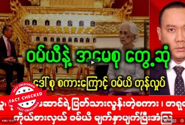 တရုတ်နိုင်ငံခြားရေးဝန်ကြီး ဝမ်ယိဟာ နေပြည်တော်မှာ အကျယ်ချုပ်ကျနေတဲ့ လူထုခေါင်းဆောင် ဒေါ်အောင်ဆန်းစုကြည်နဲ့ သွားရောက်တွေ့ဆုံခဲ့တယ် ဆိုပြီး ဗွီဒီယိုတခု ယူကျူ့မှာဖြန့်ဝေထားရာမှာ ပျံ့နှံ့နေတာတွေ့ရတယ်။ သတင်းတု ဖြန့်ချိနေခြင်းဖြစ်တယ်။