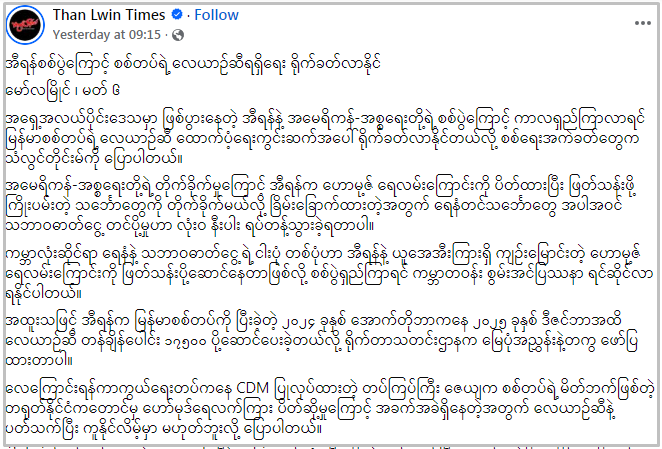 အခုလည်း သံလွင်တိုင်းမ်သတင်းဌာနကဖော်ပြခဲ့တဲ့ “အီရန်စစ်ပွဲကြောင့် စစ်တပ်ရဲ့ လေယာဉ်ဆီရရှိရေး ရိုက်ခတ်လာနိုင်”၊ “နိုင်ငံရေးအကျဉ်းသား ၄၄၀၀ ကျော်သာ ပြန်လွတ်သေးတယ်လို့ PPNM ပြော”စတဲ့ သတင်းတွေကို ပြန်လည်ဖော်ပြထားတယ်။