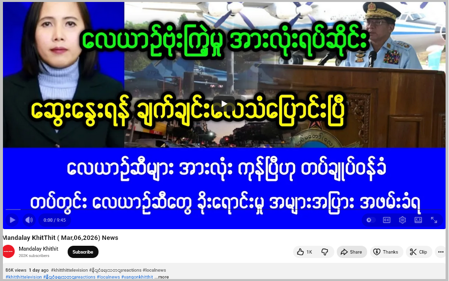 “Mandalay KhitThit”ယူကျူ့ချန်နယ်ဟာ သတင်းမီဒီယာတချို့မှာ ဖော်ပြခဲ့ ပြီးဖြစ်တဲ့ သတင်းတွေကို ပြန်လည်ကူးယူပြီး သတင်းခေါင်းစဉ်တုတပ် ဖြန့်ချိတဲ့ နေရာဖြစ်တယ်။ လေယာဉ်ဆီပြတ်တောက်သွားပြီးလို့ မြန်မာစစ်ခေါင်းဆောင်က ဝန်ခံခဲ့တဲ့ အထောက်အထားမရှိပါဘူး။ မတ် ၇ ရက်နေ့အထိ စစ်တပ်က လေယာဉ်နဲ့ ဗုံးကြဲမှုတွေ ဆက်တိုက်ပြုလုပ်နေပြီး ထိခိုက်သေဆုံးမှု တွေရှိခဲ့ပါတယ်။