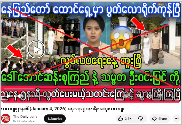 ဒေါ်အောင်ဆန်းစုကြည်နဲ့ သမ္မတဦးဝင်းမြင့်တို့ ပြည်ထောင်စုနေ့မှာ ပြန်လွတ်လာပြီဆိုတဲ့ အကြောင်းကို လုပ်ကြံရေးသားပြောဆိုချက်တွေ၊ သတင်း မီဒီယာတချို့မှာ ဖော်ပြခဲ့တဲ့အကြောင်းအရာတွေကို ခေါင်းစဉ်တုတပ်ဖြန့်ချိတာတွေ ပြုလုပ်နေတဲ့ ယူကျူ့ချန်နယ်တွေမှာသာတွေ့ရတယ်။ အခု သတင်းတု ဗွီဒီယိုတွေ ဖြန့်ဝေထားတဲ့ ဒီချန်နယ်တွေနဲ့ ပတ်သက်ပြီး Fact Crescendo Myanmar အနေနဲ့ အချက်အလက်စိစစ်ချက်တွေ မကြာခဏ ဖော်ပြခဲ့ပြီးဖြစ်တယ်။ (ဒီလင့်ခ်မှာကြည့်ပါ။)
