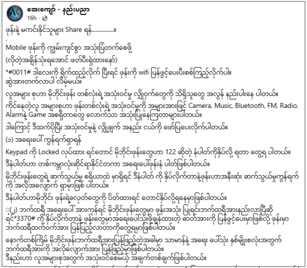 ရှည်လျားတဲ့ ပို့စ်တွေမှာ အဓိကအားဖြင့် အရေးပေါ်ဖြစ်ရင် ခေါ်ဆိုနိုင်တဲ့ဖုန်းနံပါတ်၊ အင်တာနက်အသုံးပြုမှု ပိုမိုကောင်းမွန်စေမယ့်နည်းလမ်း၊ အားကုန်နေတဲ့ ဘက်ထရီ ပြန်လည်အားပေးစေတာ၊ ပျောက်သွားတဲ့ ဖုန်းကို ပြန်ရှာနိုင်ဖို့အတွက် စတာတွေကို ဖုန်းရဲ့ ကီးဘုတ်ပေါ်မှာပါတဲ့ ဂဏန်းနဲ့ အထူးသင်္ကေတလေးတွေကို အသုံးပြုပြီး ပြုလုပ်နိုင်တယ်စသည်ဖြင့် အချက်အလက်များစွာ ဖော်ပြထားတယ်။