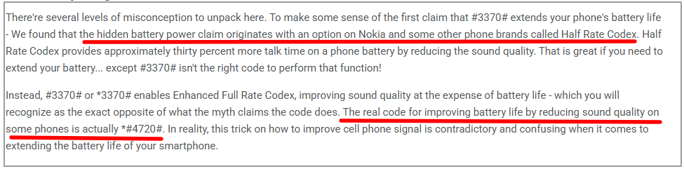 ဒီလိုပဲ *3370# ကိုနှိပ်လိုက်တာနဲ့ ဘက်ထရီအားမရှိတော့တဲ့ ဖုန်းတလုံးဟာ အား တဝက်ပြန်ပြန်ပြည့်လာမယ် ဆိုတဲ့ အချက်ဟာလည်း မမှန်ပါဘူး။ ဒီကုတ်ဟာ တကယ်တမ်းတော့ ဖုန်းအားလုံးနဲ့ သက်ဆိုင်တာမဟုတ်ပါဘူး။ စမတ်ဖုန်းတွေ မပေါ်ခင်က Nokia နဲ့ တခြား keypad ဖုန်းတွေမှာ ဖုန်းအသံ သဲသဲကွဲကွဲမကြားရတဲ့ အခြေအနေမျိုးမှာ အသံအရည်အသွေးမြှင့်ဖို့အတွက် မွန်ဖို့အတွက် အသုံးပြုတဲ့ ကုတ်တခုဖြစ်တာတွေ့ရပြီး ဘက်ထရီကို ပိုမိုအသုံးပြုရတဲ့ လုပ်ဆောင်ချက်ဖြစ်ပြီး ပြောဆိုချက်နဲ့ ဆန့်ကျင်ဘက်ဖြစ်တာတွေ့ရပါတယ်။