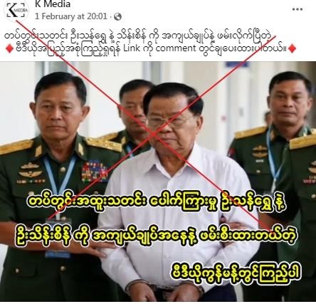 ဖေဖော်ဝါရီ ၁ ရက်မှာ စတင်ဖြန့်ဝေခဲ့တဲ့ ဖေ့စ်ဘွတ်ပို့စ်က ရယူထားတဲ့ စခရင်ရှော့ဓာတ်ပုံနဲ့ စာသားကောက်နုတ်ချက်ကို အောက်မှာကြည့်ပါ။ ဓာတ်ပုံထဲမှာ လက်ရှိဒုတိယစစ်ခေါင်းဆောင် ဗိုလ်ချုပ်ကြီး စိုးဝင်းက အရပ်ဝတ်နဲ့ ဦးသန်းရွှေကို လက်ထိပ်ခတ် ဖမ်းဆီးခေါ်လာပါတယ်။ တူညီတဲ့ ဖြန့်ဝေမှုကို ဒီနေရာ၊ ဒီနေရာနဲ့ ဒီနေရာမှာလည်း ကြည့်ပါ။