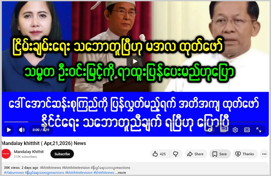 ဒီအပြင် ဗွီဒီယိုထဲမှာ တကယ်တမ်းဖော်ပြထားတဲ့ အကြောင်းအရာတွေဟာ “စစ်ကောင်စီဥက္ကဋ္ဌ မင်းအောင်လှိုင်က ၂၀၂၆ ခုနှစ်၊ ဇူလိုင်လ ၃၁ ရက်နေ့ နောက်ဆုံးထားပြီး PDF များနှင့် တိုင်းရင်းသားလက်နက်ကိုင် အဖွဲ့များ အလင်းဝင်ရောက်ကြရန် တိုက်တွန်း”၊ “ဒေါ်အောင်ဆန်းစုကြည်နှင့် နိုင်ကျဉ်းများ လွတ်မြောက်ရေး အလေးထားတောင်းဆိုပေးသည့် ဖိလစ်ပိုင်ကို ကျေးဇူးတင်”စတဲ့သတင်းတွေပါဝင်တယ်။
