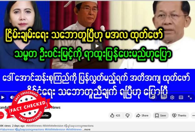 ငြိမ်းချမ်းရေးသဘောတူညီချက်အရ သမ္မတဦးဝင်းမြင့်ကို ရာထူးပြန်ပေးမယ်လို့ စစ်ခေါင်းဆောင်ဟောင်းက ပြောဆိုလိုက်တယ်လို့ဆိုထားတဲ့ ဗွီဒီယိုတွေ ယူကျူ့မှာ ပျံ့နှံ့မှုအားကောင်းနေတာတွေ့ရပါတယ်။ သတင်းသာ ဖြစ်တယ်။
