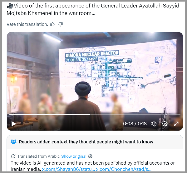အစ္စရေးရဲ့ ဒီမိုနာ(Dimona) နျူး ကလီးယား ဓာတ်ပေါင်းဖိုတိုက်ခိုက်မယ့် အစီအစဉ်မှာ ပထမဆုံးအကြိမ်အဖြစ် ရုပ်လုံးထွက်ပြပြီး အနီးကပ်ကွပ်ကဲနေတဲ့ အီရန် ခေါင်းဆောင်သစ် မိုဂ်ျတာဘာ ခါမေနီ(Mojtaba Khamenei)လို့ ဆိုပြီး ဗွီဒီယိုတခု ဖေ့စ်ဘွတ်မှာ ပျံ့နှံ့မှု အားကောင်းခဲ့တာ တွေ့ရတယ်။ တကယ်တော့ ဗွီဒီယိုဟာ AI နဲ့ပြုလုပ်ထားတဲ့ အထောက်အထားတွေ တွေ့ရပါတယ်။