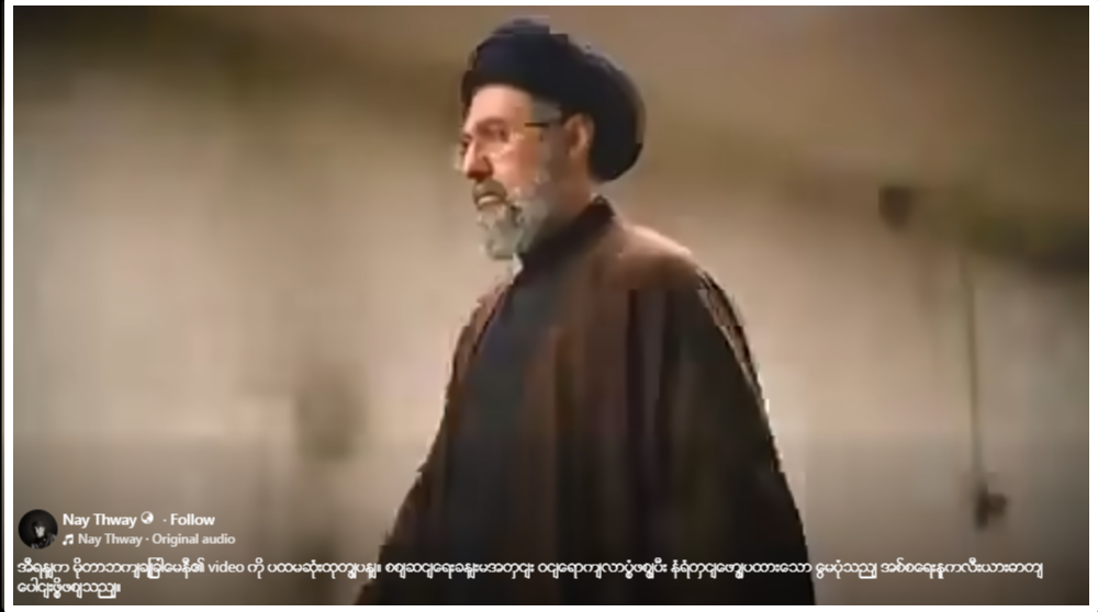 အီရန် ခေါင်းဆောင်သစ် မိုဂ်ျတာဘာ ခါမေနီ(Mojtaba Khamenei)ဟာ အစ္စရေးရဲ့ ဒီမိုနာ(Dimona) နျူး ကလီးယား ဓာတ်ပေါင်းဖိုတိုက်ခိုက်မယ့် ကိစ္စကို အနီးကပ်ကွပ်ကဲနေတဲ့ ဗွီဒီယိုဟာ ဉာဏ်ရည်တုနည်းပညာနဲ့ ဗွီဒီယိုတွေ ထုတ်လုပ်နိုင်တဲ့ ပလက်ဖောင်းတခုကို အသုံးပြုပြီး ပြုလုပ်ထားတာတွေ့ရပြီး တကယ်အဖြစ်အပျက် တခုမဟုတ်ပါဘူး။