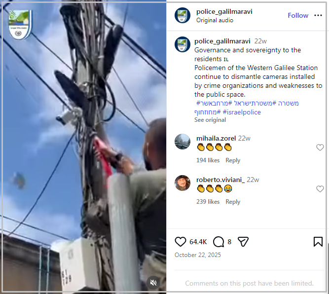 အများပြည်သူကို စောင့်ကြည့်နိုင်တဲ့နေရာမှာ ရာဇ၀တ် အဖွဲ့အစည်းတွေ စောင့်ကြည့်ကင်မရာတွေကို တပ်ဆင်ထားလို့ အစ္စရေးရဲတပ်ဖွဲ့ က ၂၀၂၅ ခုနှစ်ထဲမှာ လိုက်လံ ဖြုတ်ချနေတဲ့ ဗွီဒီယိုဖြစ်တယ်။ လက်ရှိဖြစ်ပွားနေတဲ့ ၂၀၂၆ ခုနှစ် အစ္စရေး၊အမေရိကန်နဲ့ အီရန်အကြား စစ်ပွဲနဲ့ သက်ဆိုင်ခြင်းမရှိတာတွေ့ရတယ်။