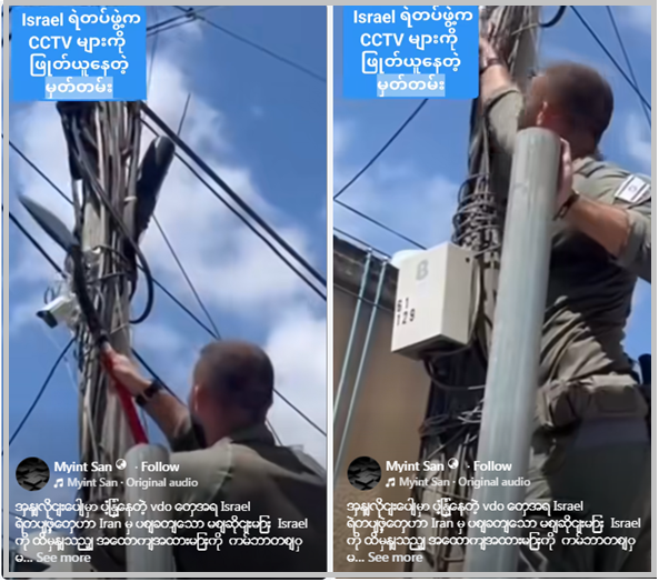 အီရန်က စောင့်ကြည့်ကင်မရာတွေကို အသုံးပြုပြီး တိုက်ခိုက်မှာ စိုးရိမ်ပြီး အစ္စရေးက စောင့်ကြည့် ကင်မရာတွေ လိုက်လံဖြုတ်ပစ်နေတယ်လို့ ပြောဆိုဖြန့်ဝေနေတဲ့ ဗွီဒီယိုတခု ဖေ့စ်ဘွတ်မှာ ပျံ့နှံ့မှု အားကောင်းခဲ့တာ တွေ့ရတယ်။ ယူနီဖောင်းဝတ် လုံခြုံရေးတဦးလို့ ယူဆရတဲ့ သူက စောင့်ကြည့်ကင်မရာတွေကို ဖျက်ဆီး နေတာကို ဒီဗွီဒီယိုထဲမှာ တွေ့ရတယ်။ ဒီ စောင့်ကြည့်ကင်မရာတွေ ဖျက်ဆီးနေတဲ့ ဗွီဒီယိုဟာ ၂၀၂၅ ခုနှစ်အတွင်းက အစ္စရေးမှာ ဖြစ်ပျက်ခဲ့တဲ့ ဖြစ်စဉ်တခုက ဖြစ်ပြီး လက်ရှိ စစ်ပွဲနဲ့ သက်ဆိုင်ခြင်း မရှိတာတွေ့ရတယ်။