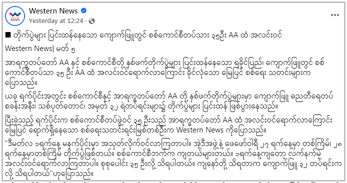 ဒီအပြင် ၈ မိနစ်ကျော်ရှည်လျားတဲ့ ဒီဗွီဒီယိုထဲမှာ Western News ကဖော်ပြခဲ့တဲ့ “တိုက်ပွဲများ ပြင်းထန်နေသော ကျောက်ဖြူတွင် စစ်ကောင်စီတပ်သား ၃၅ဦး AA ထံ အလင်းဝင်”ဆိုတဲ့ သတင်းကို ပြန်လည်ဖော်ပြထားသလို လူထုနွေဦးသတင်းဌာနကဖော်ပြခဲ့တဲ့ “ဗန်းမော်နဲ့ ဝိုင်းမော်မှာ တိုက်ပွဲဆက်ပြင်းထန်နေဟု KIAပြော”ဆိုတဲ့ သတင်းတွေကို ပြန်လည်ဖော်ပြထားတယ်။