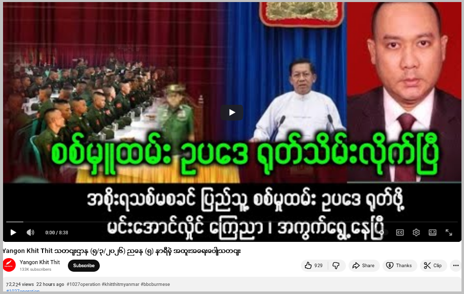ဗွီဒီယို ဖြန့်ချိထားတဲ့ “Yangon Khit Thit”အမည်နဲ့ ယူကျူ့ချန်နယ်ဟာ လုပ်ကြံရေးသားပြောဆိုမှုတွေနဲ့ သတင်းမီဒီယာတချို့က သတင်းတွေကို ရောနှော ဖြန့်ချိတာတွေ့ရတယ်။ စစ်မှုထမ်းဥပဒေ ပြန်လည် ရုပ်သိမ်းလိုက်ပြီဆိုတာ မဟုတ်သလို စစ်ခေါင်းဆောင်က ဒီလို ကြေညာခဲ့တယ်ဆိုတာလည်း မဟုတ်ပါဘူး။