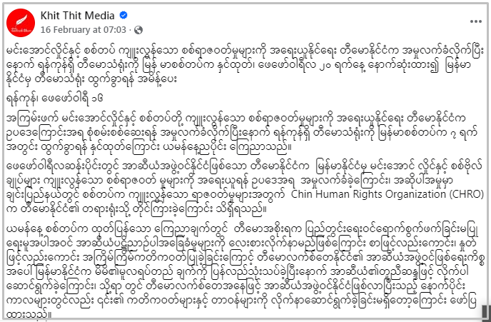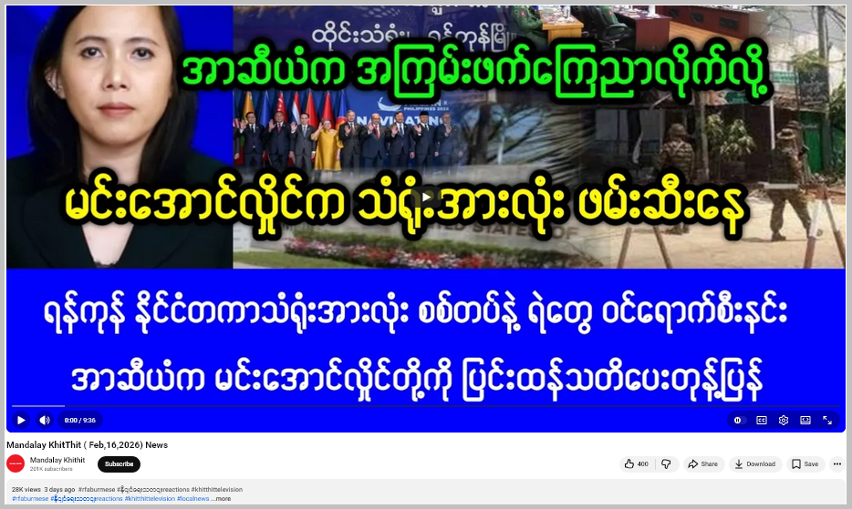 ဗွီဒီယို ဖြန့်ချိထားတဲ့ “Mandalay KhitThit”အမည်နဲ့ ယူကျူ့ချန်နယ်ဟာ သတင်းလုပ်ငန်းလုပ်ကိုင်နေတဲ့ မီဒီယာတချို့က သတင်းတွေကို သတင်းခေါင်းစဉ်တုတပ်ကာ ဖြန့်ချိတဲ့နေရာဖြစ်တယ်။ စစ်ခေါင်းဆောင် မင်းအောင်လှိုင်နဲ့ စစ်တပ်က ကျူးလွန်တဲ့ စစ်ရာဇဝတ်မှုတွေအတွက် ချင်းလူ့အခွင့်အရေးအဖွဲ့က တီမောတရားရုံးမှာ တရားစွဲဆိုမှုကို တီမောနိုင်ငံက လက်ခံခဲ့တဲ့အတွက် မြန်မာစစ်တပ်က တီမောသံအရာရှိကို နင်ထုတ်တဲ့သတင်းကို လိုအပ်သလိုခေါင်းစဉ်တုတပ်ထားတယ်။
