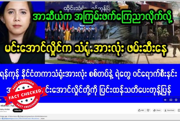 အာဆီယံက အကြမ်းဖက်ကြေညာလိုက်လို့ ရန်ကုန်မှာရှိတဲ့ နိုင်ငံတကာသံရုံးအားလုံးကို စစ်ခေါင်းဆောင် ဗိုလ်ချုပ်မှူးကြီးမင်းအောင်မင်းအောင်လှိုင်လက်အောက်ခံ စစ်တပ်နဲ့ ရဲက ဝင်ရောက်စီးနင်းနေတယ်လို့ ဆိုပြီး ဗွီဒီယိုတခု ယူကျူ့မှာ ပျံ့နှံ့မှုအားကောင်းနေတာ တွေ့ရပါတယ်။ သတင်းတု သာဖြစ်တယ်။