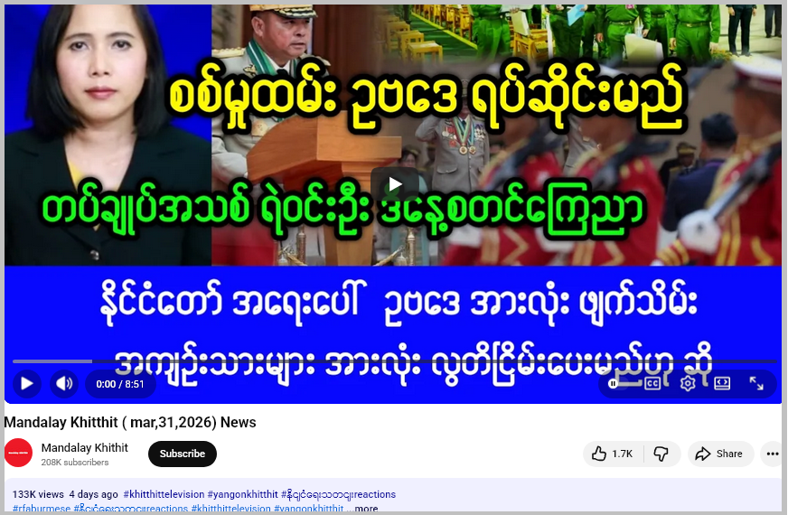 ဗွီဒီယိုဖြန့်ဝေထားတဲ့ “Mandalay KhitThit”အမည်နဲ့ ယူကျူ့ချန်နယ်ဟာ လုပ်ကြံရေးသားပြောဆိုချက်တွေနဲ့ သတင်းမီဒီယာတချို့မှာဖော်ပြခဲ့တဲ့ သတင်းအကြောင်းအရာတွေကို သတင်းခေါင်းစဉ်တပ်ကာ ပြန်လည် ဖြန့်ချိလေ့ရှိပါတယ်။ ဒီချန်နယ်နဲ့ ပတ်သက်ပြီး Fact Crescendo Myanmar ရဲ့ အချက်အလက်စိစစ်မှုတွေကို ဒီနေရာမှာကြည့်ပါ။