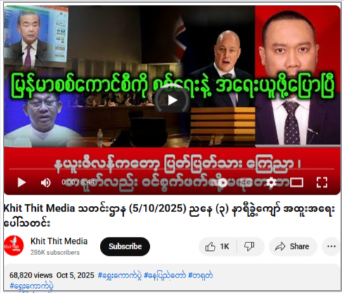 ဗွီဒီယိုဖြန့်ဝေထားတဲ့ “Khit Thit Media”အမည်နဲ့ ယူကျူ့ချန်နယ်ဟာ သတင်းမီဒီယာတချို့က သတင်းတွေကို ကူးယူပြီး ပြန်လည်ဖြန့်ချိရာမှာ သတင်းခေါင်းစဉ်တုတပ်ကာ ဖြန့်ဝေလေ့ရှိတာတွေ့ရတယ်။  ဒီယူကျူ့ချန်နယ် ဟာ ရန်ကုန်ခေတ်သစ် သတင်းဌာနရဲ့ ယူကျူ့ချန်နယ်နာမည်ကို တုပထားပြီး မကြာခဏဆိုသလို  Fact Crescendo Myanmar အနေနဲ့ အချက်အလက်စိစစ်ဖော်ပြခဲ့ပြီးဖြစ်တယ်။