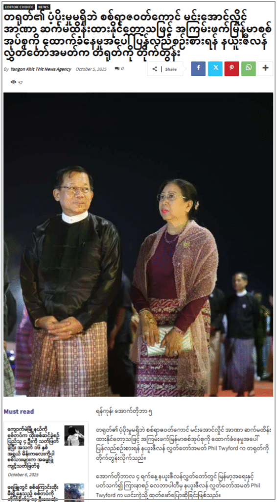ရန်ကုန်ခေတ်သစ်သတင်းဌာနကဖော်ပြခဲ့တဲ့ တရုတ်ပံ့ပိုးမှုမရှိရင် မြန်မာစစ်တပ်ဟာ အာဏာ ဆက်လက်ထိန်း ထားဖို့ မဖြစ်နိုင်တဲ့  မြန်မာစစ်အုပ်စုကို ထောက်ခံနေမှုအပေါ် ပြန်လည်စဉ်းစားဖို့ တရုတ်ကို နယူးဇီလန် လွှတ်တော်အမတ် Phil Twyford တိုက်တွန်းတဲ့ သတင်းကို ပြန်လည်ဖော်ပြထားတယ်။ အောက်တိုဘာ ၄ ရက်က နယူးဇီလန် လွှတ်တော်မှာ လုပ်တဲ့ ကြားနာပွဲမှာ ပြောကြားတဲ့ သတင်းကို ပြန်လည်မျှဝေထားတာတွေ့ရတယ်။ ဒီသတင်းထဲမှာ မင်းအောင်လှိုင်ဟာ တရုတ်ရဲ့ ပံ့ပိုးကူညီမှု မရှိဘဲနဲ့ အာဏာကို ရနိုင်မှာမဟုတ်ကြောင်း၊ မင်းအောင်လှိုင်ရဲ့ စစ်ရာဇဝတ်မှု လူသားမျိုးနွယ်အပေါ် ကျူးလွန်တဲ့ ရာဇဝတ်မှုတွေမှာ တရုတ်က ပါဝင်နေတာဖြစ်ကြောင်း၊ ဒီကိစ္စဟာ အင်အားကြီးမားပြီး လေးစားစားရတဲ့ နိုင်ငံကြီးတစ်ခုရဲ့ အပြုအမူမဟုတ်တာ တွေ့ရကြောင်း စသည်ဖြင့် တရုတ်ရဲ့ မြန်မာစစ်တပ်အပေါ် ရပ်တည်ချက်တွေကို ဝေဖန် ပြောကြားချက်တွေ ပါဝင်ပါတယ်။ ဒါပေမဲ့ စစ်ရေးအရ မြန်မာစစ်တပ်အပေါ် အရေးယူဖို့အကြောင်း မပါဝင်ပါဘူး။