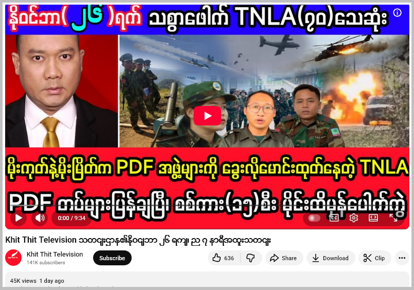 ဗွီဒီယိုဖြန့်ဝေထားတဲ့ “Khit Thit Television”အမည်နဲ့ ယူကျူ့ချန်နယ်ဟာ သတင်းခေါင်းစဉ်တုတပ် ဗွီဒီယိုတွေ ဖြန့်ချိတဲ့နေရာ တခုဖြစ်တယ်။ ဒီချန်နယ်နဲ့ ပတ်သက်ပြီး Fact Crescendo Myamar ရဲ့ အချက်အလက်စိစစ်ချက် တွေကို ဒီလင့်ခ်မှာ ကြည့်ပါ။
