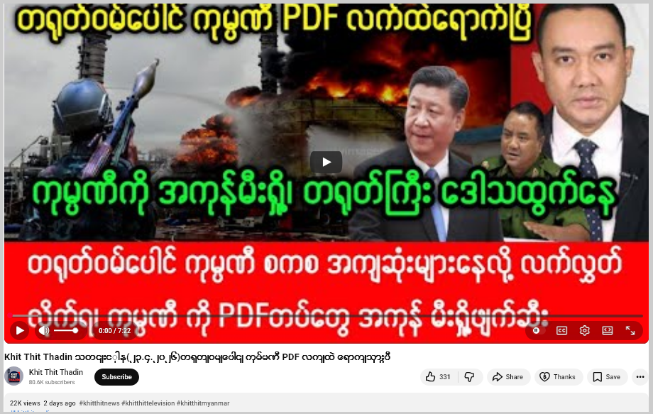 ဗွီဒီယိုဖြန့်ဝေထားတဲ့ “Khit Thit Thadin”အမည်နဲ့ ယူကျူ့ချန်နယ်ဟာ လုံးဝလုပ်ကြံရေးသားဖြန့်ဝေမှုတွေ ဒါမှမဟုတ် သတင်းမီဒီယာတချို့က သတင်းတွေကို ပြန်လည်ဖော်ပြပြီး သတင်းခေါင်းစဉ်တုဖြန့်ချိတာ ပြုလုပ်တဲ့နေရာဖြစ်တယ်။ ဒီလင့်ခ်မှာ ကြည့်ပါ။
