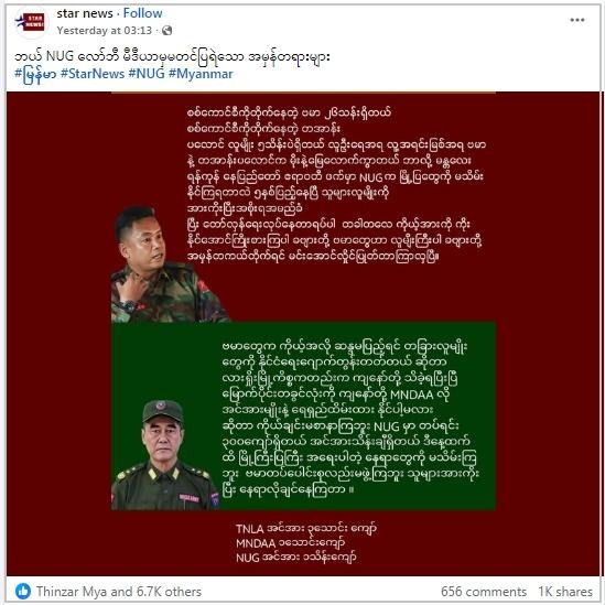 “ဘယ် NUG လော်ဘီ မီဒီယာမှမတင်ပြရဲသော အမှန်တရားများ”ဆိုပြီး “star news”အမည်နဲ့ ဖေ့စ်ဘွတ်စာမျက်နှာက ဖော်ပြချက်ကို အောက်မှာကြည့်ပါ။ ဗမာ လူဦးရေ ၂၆ သန်းရှိပြီး စစ်ကောင်စီကို တော်လှန်နေတယ်ဆိုပေမဲ့ မြို့တမြို့တောင် NUG က သိမ်းပိုက်နိုင်ခြင်းမရှိကြောင်း၊ ဗမာတွေ ညံ့ဖျင်းလို့ တော်လှန်ရေး မအောင်တာဖြစ်ကြောင်း စသည်ဖြင့် TNLA က ဗိုလ်ချုပ်တာဘုန်းကျော်က ဝေဖန်ထားပြီး MNDAA ခေါင်းဆောင် ဖုန်တာရွှင်လည်းက အလားတူပြောဆိုထားတယ်။