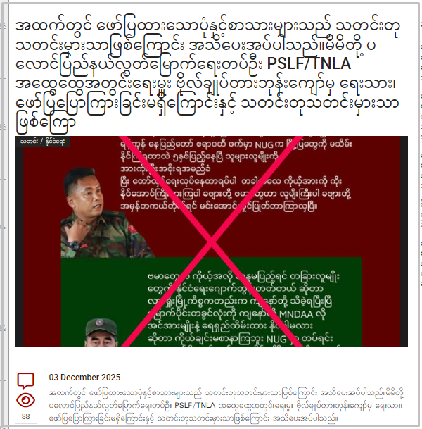 TNLA အထွေထွေအတွင်းရေးမှူး ဗိုလ်ချုပ်တာဘုန်းကျော်၊ MNDAA ခေါင်းဆောင် ဖုန်တာရွှင်တို့က NUG အပေါ် ဝေဖန်ချက်ဆိုပြီး ပို့စ်တခု ဖေ့စ်ဘွတ်မှာ ပျံ့နှံ့မှုအားကောင်းလျက်ရှိတယ်။ နားလည်မှုလွဲမှားစေနိုင်တဲ့ သတင်းတု ဖြန့်ချိနေခြင်းဖြစ်တယ်။ TNLA ကလည်း ဗိုလ်ချုပ်တာဘုန်းကျော်က ဒီလိုပြောကြားချက် မရှိကြောင်း တရားဝင် ငြင်းဆိုထားတယ်။