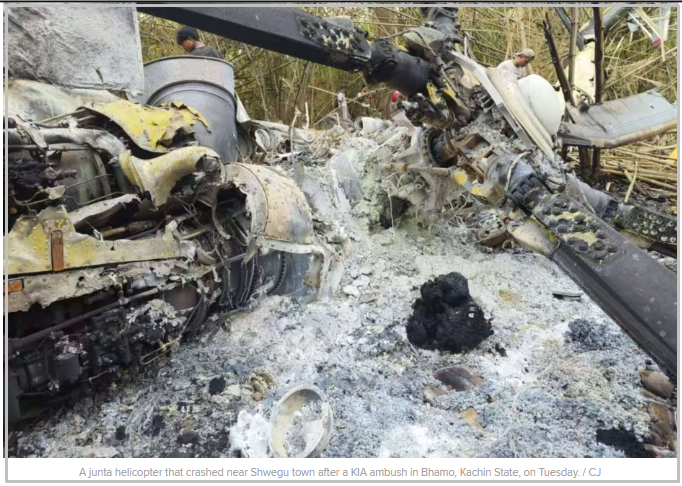 ဒီအပြင် ဗွီဒီယိုထဲမှာ အသုံးပြုထားတဲ့ ထိုင်းစစ်တပ်က ပစ်ချလိုက်တဲ့ မြန်မာစစ်တပ်လေယာဉ်အဖြစ် ဖော်ပြနေတဲ့ ဓာတ်ပုံကို ၂၀၂၅ ခုနှစ် မေ ၂၂ ရက်က ဧရာဝတီသတင်းဌာနရဲ့ အင်္ဂလိပ်ပိုင်း သတင်းမှာဖော်ပြထားတာတွေ့ရပြီး ရွှေကူမြို့ ခလရ ၅၆ အနီးမှာ ကချင်လွတ်လပ်ရေးတပ်မတော်(KIA)တိုက်ခိုက်မှုကြောင့် ပျက်ကျခဲ့တဲ့ ရဟတ်ယာဉ်ဖြစ်တယ်လို့ ဓာတ်ပုံအညွှန်းစာမှာ ဖော်ပြတယ်။