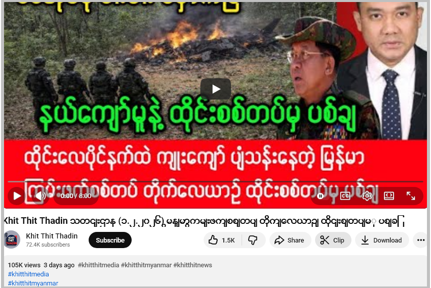 “Khit Thit Thadin” ယူကျူ့ချန်နယ်ဟာ သတင်းမီဒီယာ တချို့က သတင်းတွေကို သတင်းခေါင်းစဉ်တု တပ်ကာပြန်လည် ဖြန့်ချိသလို လုပ်ကြံရေးသားပြောဆိုချက်တွေလည်း ဖြန့်ချိပါတယ်။ နယ်နိမိတ်ကျော် ပျံသန်းမှုနဲ့ မြန်မာစစ်တပ်လေယာဉ်ကို ထိုင်းစစ်တပ် ပစ်ချလိုက်တယ်ဆိုတဲ့ သတင်းဟာ သတင်းတုဖြစ်ပြီး ကျန်သတင်းတွေဟာ မီဒီယာတချို့က သတင်းတွေကို ပြန်လည်ကူးယူဖော်ပြထားခြင်းဖြစ်တာတွေ့ရတယ်။
