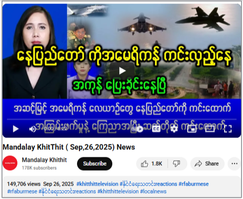 ဗွီဒီယို ဖြန့်ချိထားတဲ့ “Mandalay KhitThit”အမည်နဲ့ ယူကျူ့ချန်နယ်ဟာ သတင်းလုပ်ငန်းလုပ်ကိုင်နေတဲ့ မီဒီယာတချို့က သတင်းတွေကို သတင်းခေါင်းစဉ်တုတပ်ကာ ဖြန့်ချိနေခြင်းဖြစ်တယ်။ ဖေ့စ်ဘွတ်အသုံးပြုသူ တဦးရေးသားတဲ့ မြန်မာစစ်တပ်လက်နက်ပွဲစားကုမ္ပဏီအပါအဝင် လူ၃ ဦးနဲ့ မြန်မာစစ်တပ်ကို လက်နက်ရောင်းတဲ့ မြောက်ကိုရီးယား ၂ ဦးကို အမေရိကန်ပိတ်ဆို့အရေးယူမှုဟာ မြန်မာအရေးအပေါ် အမေရိကန်ရဲ့ စိတ်ဝင်စားမှု မြင့်တက်မှုဖြစ်တယ်ဆိုတဲ့ ဆောင်းပါးကို ပြန်လည်ဖြန့်ချိကာ ခေါင်းစဉ်တုတပ်ထားခြင်းဖြစ်တယ်။