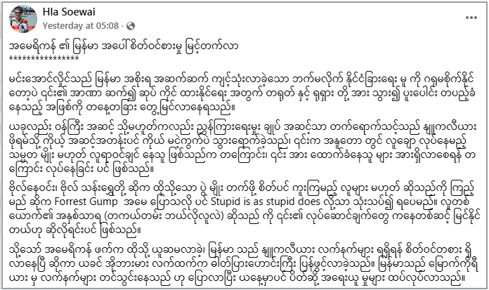 အခုလည်း ဗွီဒီယိုထဲမှာပါဝင်တဲ့အကြောင်းအရာဟာ ဖေ့စ်ဘွတ်အသုံးပြုသူတဦး ရေးသားတဲ့ “အမေရိကန် ၏ မြန်မာ အပေါ် စိတ်ဝင်စားမှု မြင့်တက်လာ”ဆိုတဲ့ အတွေးအမြင်ဆောင်းပါးကို ပြန်လည်ဖော်ပြထားတယ်။