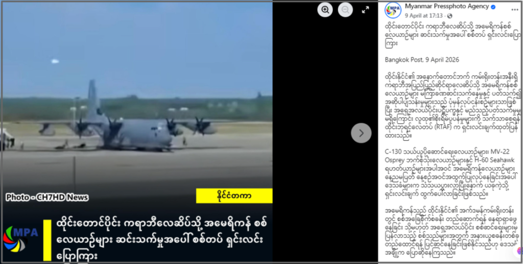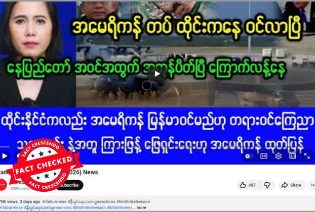 အခုလည်း သတင်းခေါင်းစဉ်တုတပ် ဗွီဒီယိုတွေထဲမှာ ဖော်ပြထားတဲ့အကြောင်းအရာတွေဟာ ထိုင်းနိုင်ငံတောင်ပိုင်းက ခရာဘီလေဆိပ်မှာ အမေရိကန် စစ်လေယာဉ်တွေ အဆင်းအတက် ပြုလုပ်နေခဲ့တာနဲ့ ပတ်သက်ပြီး ဒေသခံတွေ စိုးရိမ်စရာ မလိုတဲ့အကြောင်း၊ အရှေ့အလယ်ပိုင်း ပဋိပက္ခနဲ့ သက်ဆိုင်ခြင်းမရှိဘဲ အမေရိကန် စစ်တပ်အတွက် ပုံမှန်တပ်အပြောင်းအလဲ ပြုလုပ်မှုသာဖြစ်ကြောင်း ထိုင်းလေတပ်က ရှင်းလင်း ပြောကြားမှု သတင်းကို ပြန်လည်ဖော်ပြထားခြင်းဖြစ်တယ်။ ဒီသတင်းကို မြန်မာဘာသာနဲ့ ဖြန့်ဝေတဲ့ သတင်းမီဒီယာတွေမှာလည်း ပြန်လည်ဖော်ပြခဲ့တာတွေ့ရပါတယ်။ ဒီလင့်ခ်နဲ့ ဒီလင့်ခ်မှာ ကြည့်ပါ။