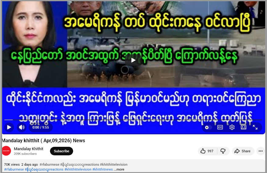 “Mandalay Khitthit ” ယူကျူ့ချန်နယ်အပါအဝင် မြန်မာကို အရေးယူဖို့ အမေရိကန်စစ်တပ် ထိုင်းကတဆင့် ဝင်လာပြီလို့ ပြောဆိုထားတဲ့ ယူကျူ့ချန်နယ်တွေဟာ သတင်းမီဒီယာ တချို့က သတင်းတွေကို သတင်းခေါင်းစဉ်တု တပ်ကာ ဖြန့်ချိလေ့ရှိပြီး ဒီချန်နယ်နဲ့ပတ်သက်ပြီး Fact Crescendo Myanmar က အချက်အလက်စိစစ်ချက်တွေ မကြာခဏဖော်ပြခဲ့ပြီးဖြစ်တယ်။